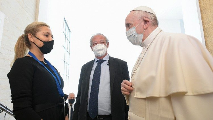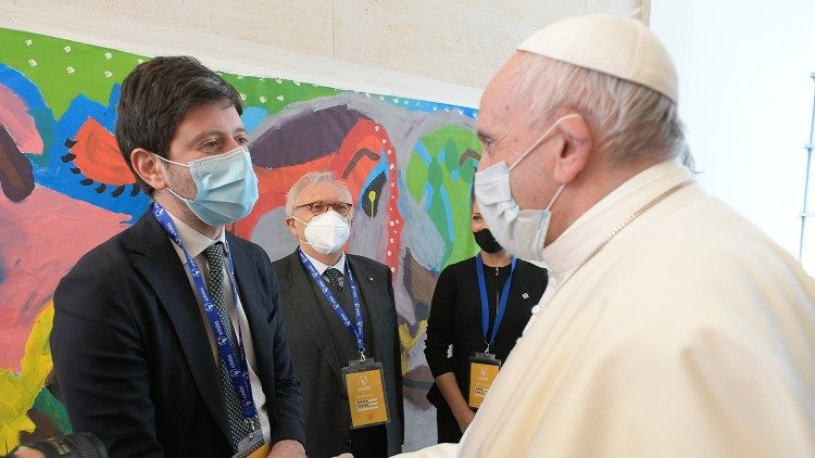 Ezután a pápát az argentin first lady, Fabiola Yáñez köszöntötte, aki részt vesz a Scholas munkájában, majd Roberto Speranza olasz egészségügyi és Patrizio Bianchi olasz oktatási miniszter üdvözölte.