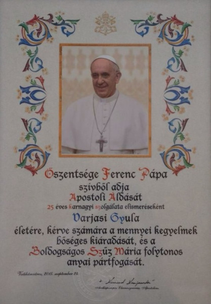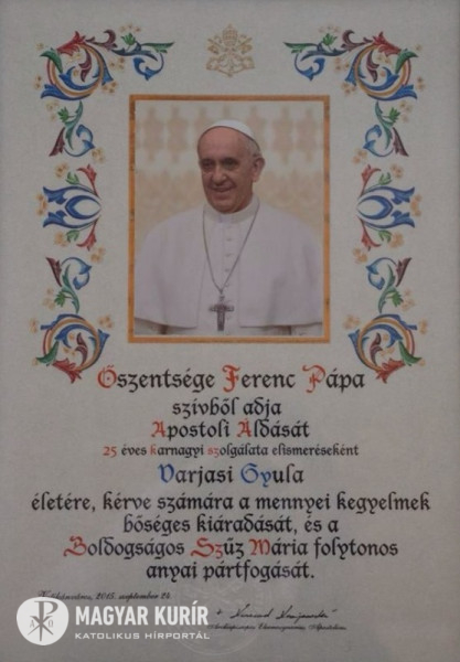 Ferenc pápa áldását és köszönetét tartalmazó díszoklevelet adott át Kondé Lajos, a szegedi dóm plébánosa Varjasi Gyula karvezetőnek, aki 25 éve vezeti a dóm kórusát. Ez a ma már közel 65 éve működő kórus minden csütörtökön próbát tart, hogy felkészüljön a vasárnapi liturgikus szolgálatra, és Varjasi Gyula vezetésével minden vasárnap, valamint a püspöki szentmiséken énekelnek – méltatta szerkesztőségünknek Kondé Lajos a hosszú évek szolgálatát.