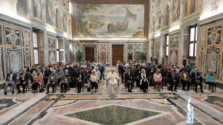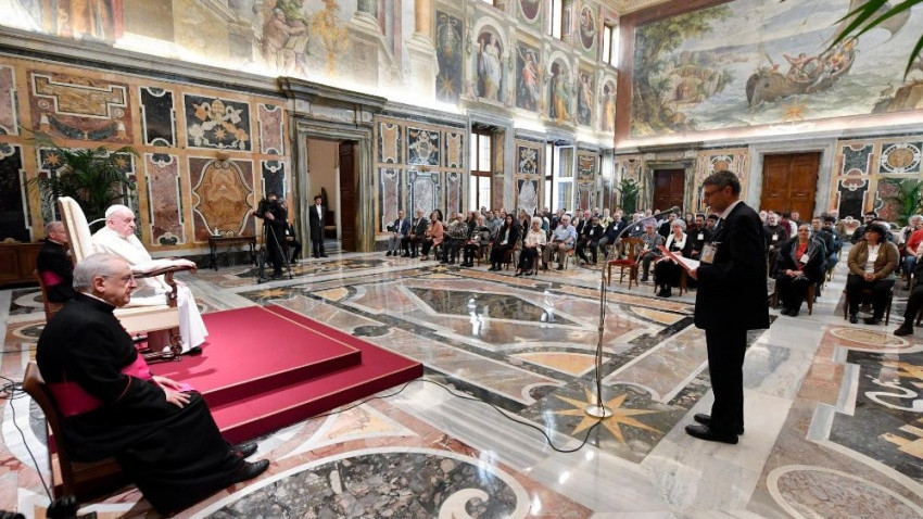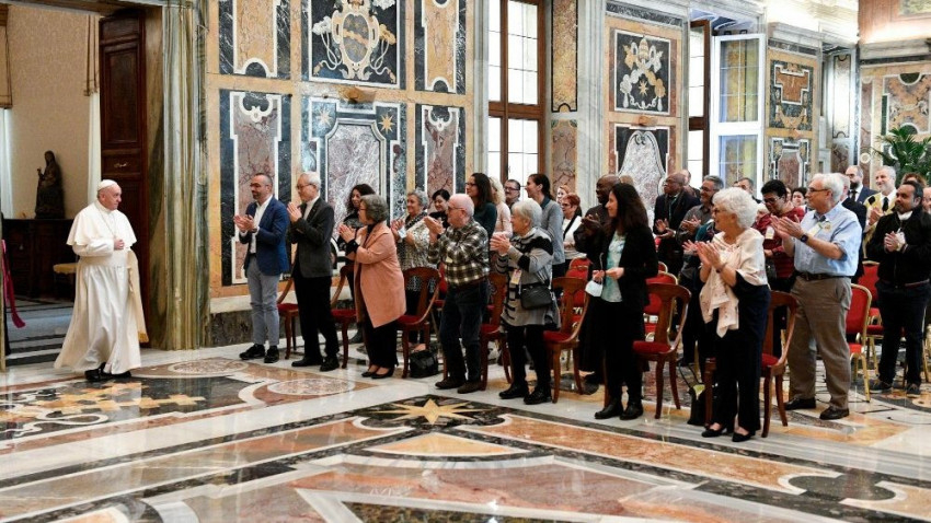 „Az Úr adjon neked békességet!” – Szent Ferenc szavaival köszöntötte a pápa a résztvevőket, majd arról beszélt, hogy hivatásuk az életszentségre szóló egyetemes hívásból fakad. A Katolikus Egyház katekizmusa emlékeztet, hogy „A világi hívők részesednek Krisztus papságában: egyre inkább egyesülve Ővele, a keresztség és a bérmálás kegyelmét az élet mindenfajta – személyes, családi, társadalmi és egyházi – helyzetében kibontakoztatják, és teljesítik a minden megkereszteltet életszentségre szólító meghívást” (KEK, 941).