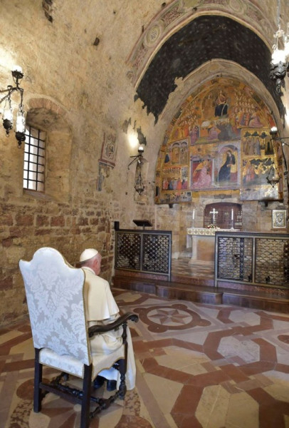 A gyóntatást követően köszöntötte a ferences testvéreket és a helyi püspököket, végül üdvözölt egy perugiai imámot. A köszöntések után meglátogatta a ferences rendház gyengélkedőjében ellátott tíz ferences idős és beteg testvért.