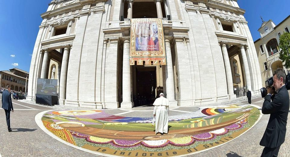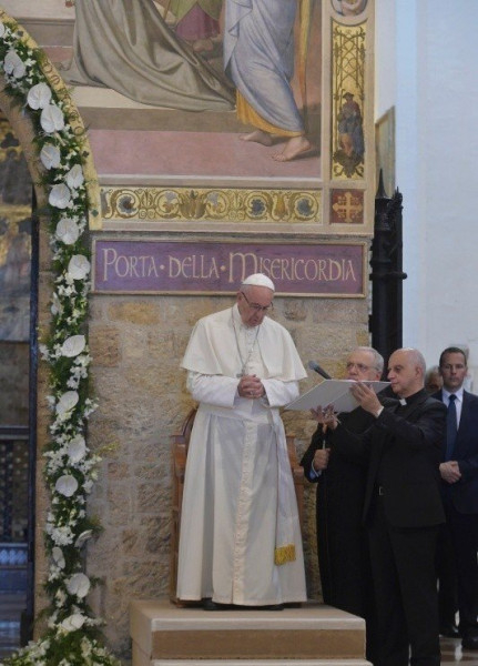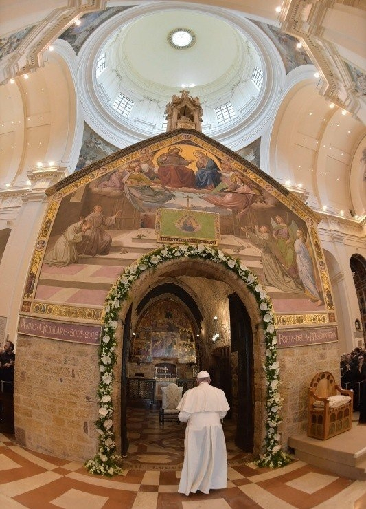 Kedves Testvéreim! A megbocsátás, amelynek Szent Ferenc „csatornájává” vált itt, a Porziuncolánál, továbbra is „paradicsomot szül”, még nyolc évszázaddal később is. Az irgalmasságnak ebben a szentévében még nyilvánvalóbbá válik, ahogyan a megbocsátás útja valóban képes megújítani az egyházat és a világot. Tanúságot tenni az irgalmasságról a mai világban olyan feladat, amely alól senki sem vonhatja ki magát. Megismétlem: tanúságot tenni az irgalmasságról a mai világban olyan feladat, amely alól senki sem vonhatja ki magát. A világ rászorul a megbocsátásra; nagyon sokan élnek neheztelésbe zárkózva és haragot táplálva, mert képtelenek megbocsátani, tönkreteszik saját életüket és mások életét, ahelyett, hogy megtalálnák a lelki béke derűjét és örömét. Kérjük Szent Ferencet, járjon közben értünk, hogy sose mondjunk le arról, hogy a megbocsátás alázatos jelei és az irgalmasság eszközei legyünk.