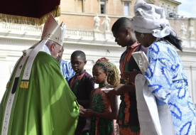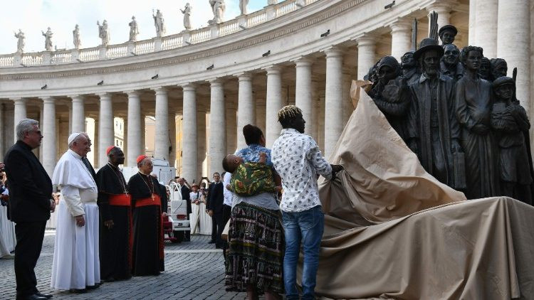 Eme elkötelezettségünk hangsúlyozására hamarosan leleplezem azt a szobrot, amelynek témája a Zsidóknak írt levélnek ezek a szavai: „Ne hanyagoljátok el a vendégszeretetet, mert ezáltal egyesek tudtukon kívül angyalokat láttak vendégül!” (Zsid 13,2). Ez a bronzból és agyagból készült szobor különféle kultúrákból és történelmi korszakokból származó bevándorlók csoportját ábrázolja. Azért akartam, hogy ez a műalkotás itt legyen a Szent Péter téren, hogy mindenkit emlékeztessen a befogadás evangéliumi feladatára.