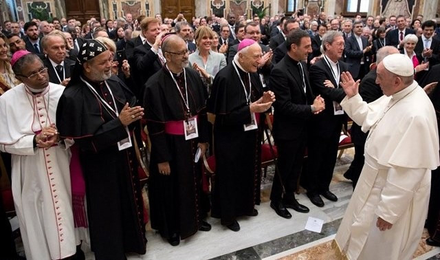 Ferenc pápa a jelenlegi nemzetközi helyzet politikai kihívásokkal teli összetettségére is utalt, melyet a viszálykodások bizonytalan légköre teremt. A fegyverkezés spirálja sajnos nem áll meg és a nemzetek mind nagyobb összeget fordítanak hadicélokra, köztük nukleáris fegyverekre is, ahelyett, hogy folgalkoznának a szenvedő emberiség valóságos kérdéseivel, mint a szegénység elleni harc, a béke előmozdítása, a nevelés, az egészség szolgálata és a környezet védelme.