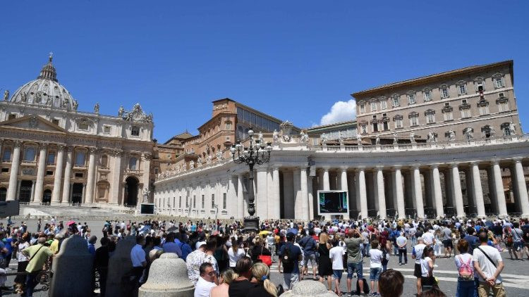 Köszöntelek mindannyiatokat, kedves római hívek és zarándokok – kezdenek felbukkanni –, akik Olaszország különböző tájairól és – egyre többen – más országokból is jöttök! Látom, vannak, akik zászlókat is hoztak magukkal… Külön is köszöntelek benneteket, fiatalok: ma Gonzága Szent Alajosra, egy olyan fiúra emlékezünk, aki tele volt szeretettel Isten és felebarátai iránti. Nagyon fiatalon halt meg itt, Rómában, mert a pestisbetegeket gondozta. Az ő közbenjárására bízom a világon élő összes fiatalt.
