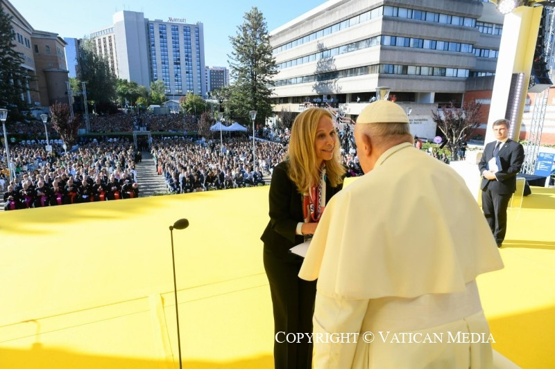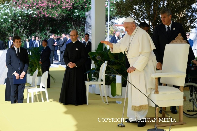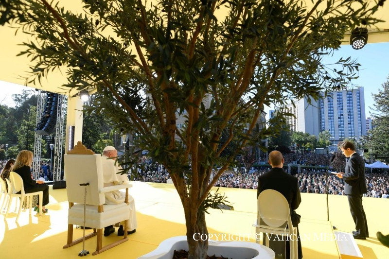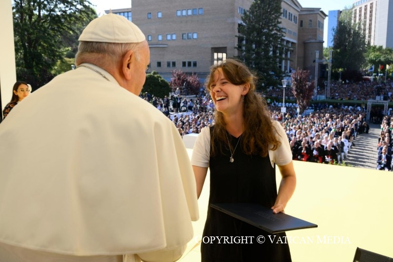 Köszönöm, Tomás, hogy azt mondtad: „Isten nélkül nem lehetséges valódi átfogó ökológia”, és „nem lehet jövő egy Isten nélküli világban”. Azt szeretném kérni tőletek, hogy a hitet döntéseitekkel tegyétek hitelessé. Mert ha a hit nem szül meggyőző életmódot, akkor nem keleszti meg a világ tésztáját. Nem elég meggyőződött kereszténynek lenni, meggyőzőnek is kell lennünk. Tetteinknek tükrözniük kell az evangélium – örömteli és radikális – szépségét. Továbbá a kereszténységet nem lehet úgy felfogni, mint egy fallal körülvett erődöt, mely bástyaként áll a világgal szemben. Ezért nagyon elgondolkodtatónak találtam Beatriz tanúságtételét; azt mondta, úgy érzi, hogy éppen „a kultúra közegéből kiindulva” kell megélnie a boldogmondásokat. Minden korban a keresztények egyik legfontosabb feladata, hogy visszanyerjék a megtestesülés értelmét. A megtestesülés nélkül a kereszténység ideológiává válik – és a „keresztény ideológiák” kísértése ma erősen jelen van. A megtestesülés teszi lehetővé számunkra, hogy elámuljunk azon a szépségen, amelyet Krisztus minden egyes testvérünkön és nővérünkön, minden egyes férfin és nőn keresztül feltár előttünk.