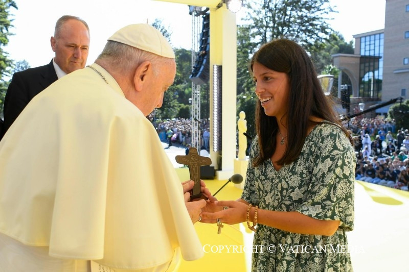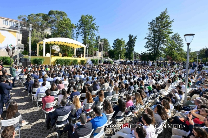 Beatriz, Mahoor, Mariana és Tomás, köszönöm tanúságtételeteket; mindegyikben a remény hangja hallatszott, reális lelkesedéssel, nem volt bennük panaszkodás, sem illuzórikus előremenekülés. Ti főszereplők akartok lenni, „a változás főszereplői”, ahogy Mariana mondta. Titeket hallgatva eszembe jutott José de Almada Negreiros író egyik mondata, mely talán ismerős lehet nektek: „Olyan országról álmodtam, ahol mindenki tanárrá vált” (A Invenção do Dia Claro [Rátalálni a fényes napra]).
