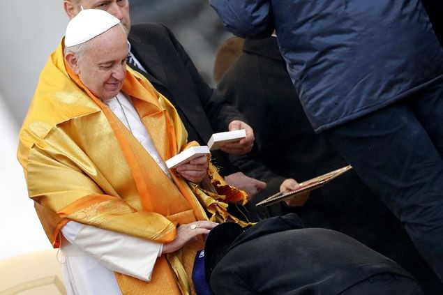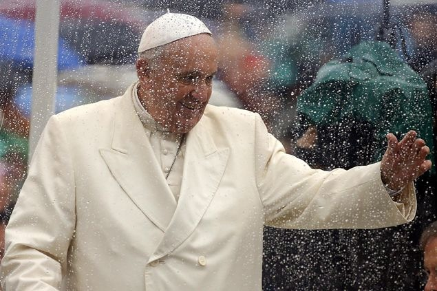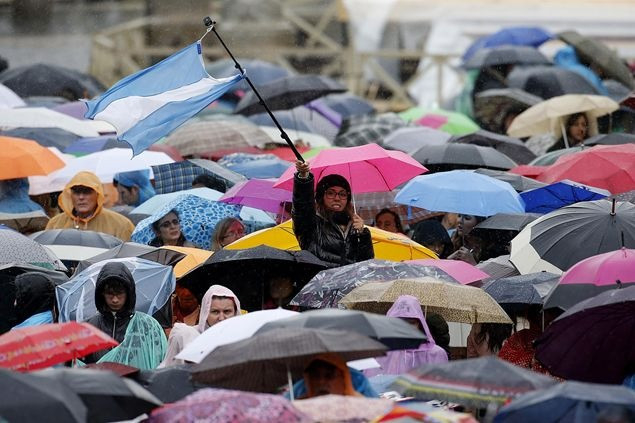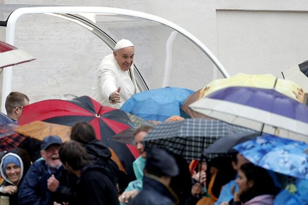 Jó napot! Bár nincs valami szép napunk, ugye? Ma a kihallgatást két különböző helyen tartjuk – mindig így csináljuk, amikor esik az eső –, ti itt, a téren, sok beteg pedig a VI. Pál-teremben, ők kivetítőkön követik a kihallgatást. A testvériség jeleként köszöntsük őket tapssal! Ugye, nem is könnyű esernyővel a kézben tapsolni?