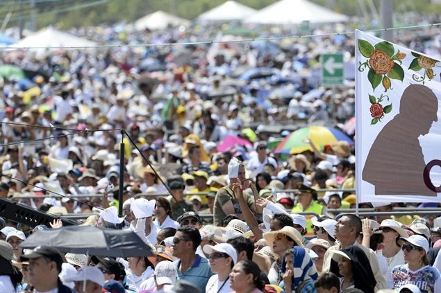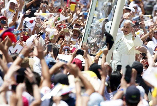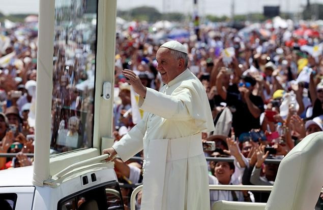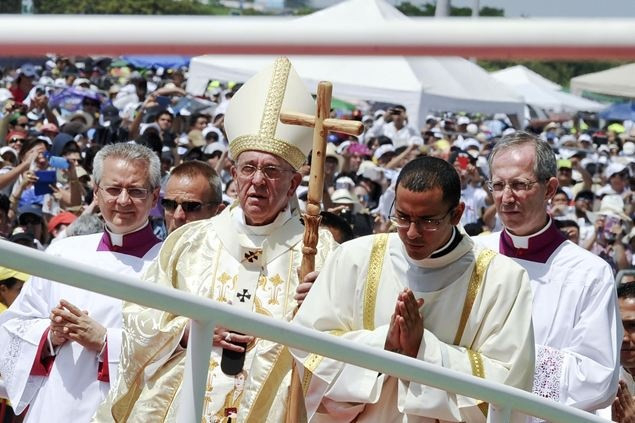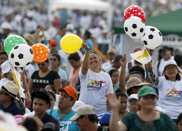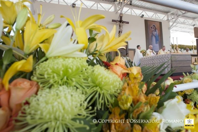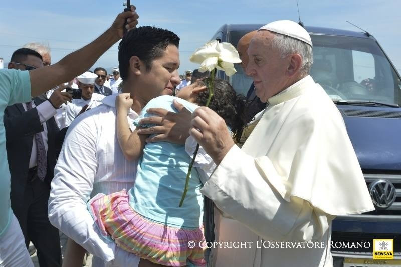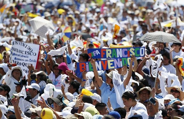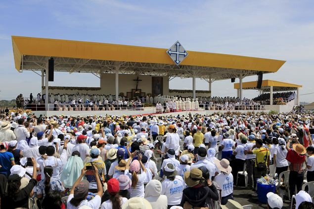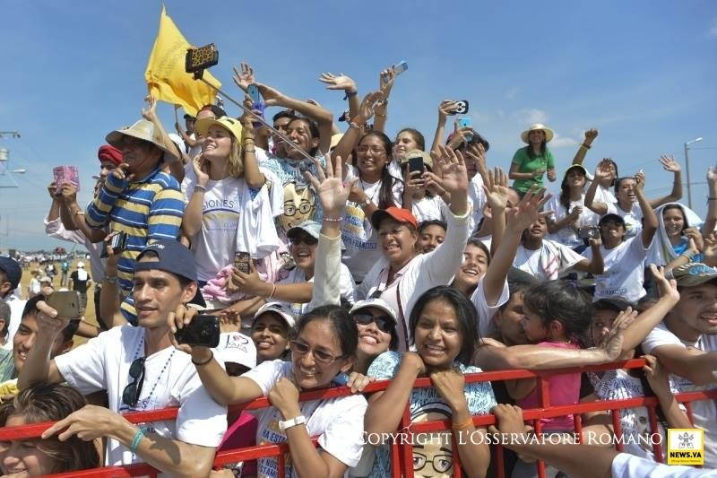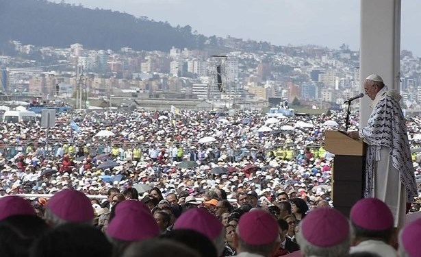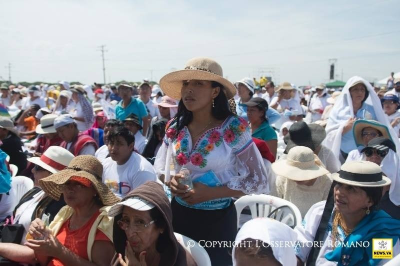 Ferenc pápa a Bicentenáriumi parkban a szentmise előtt körbejárt a pápamobilon, hogy köszöntse a teret megtöltő lelkes hívősereget. A szentmise, melyet a Szentatya az ecuadori püspökökkel közösen mutatott be, helyi idő szerint fél 11-kor (magyar idő szerint este fél 6-kor) kezdődött. Az evangéliumot János evangéliumának 17. fejezetéből, Jézus utolsó vacsorán mondott könyörgéséből vették (11b, 17–23): „Szent Atyám, tartsd meg őket a te nevedben, amelyet nekem adtál, hogy egy(ek) legyenek, mint mi. (…) Ahogy engem a világba küldtél, úgy küldtem őket én is a világba…”