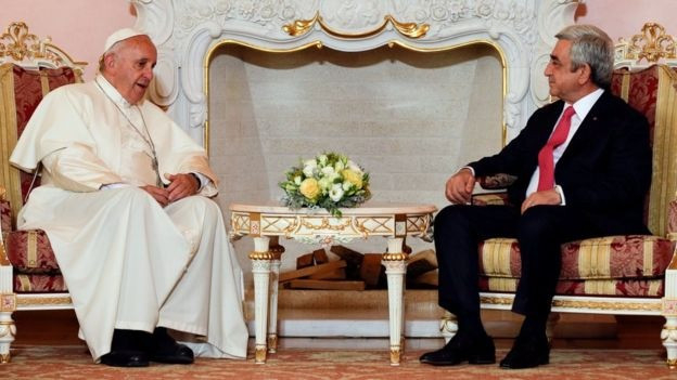 A Szentatya felidézte Szerzs Szárgszján múlt évi vatikáni látogatását, amikor II. Garegin katholikosszal, XIX. Nerszész Péter örmény katolikus pátriárkával és I. Aram pátriárkákkal együtt 2015. április 12-én részt vettek a vatikáni Szent Péter-bazilikában azon a liturgián, amelyen megemlékeztek az örmény népirtás centenáriumáról. „A Mec Jeghern, a Sorscsapás sújtotta az örmény népet és hatalmas embertömeg halálát okozta. Ez a tragédia vezette be a múlt század szörnyűséges katasztrófáinak sorát, melyek megtévelyedett faji, ideológiai vagy vallási alapon jöttek létre és homályosították el a hóhérok elméjét, egészen odáig menően, hogy célul tűzzék ki egész népek megsemmisítését” – hangsúlyozta a pápa.