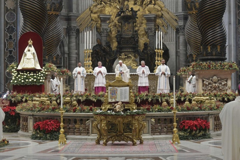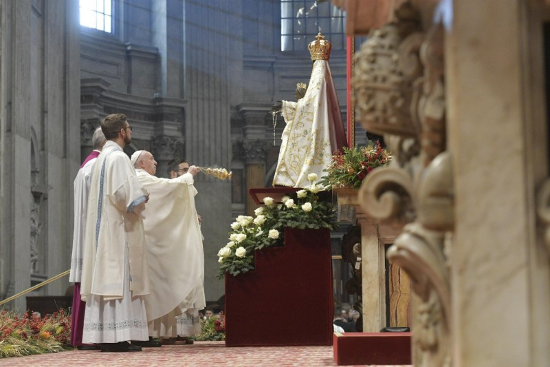 Ha az Egyház közeledik Máriához, akkor újra rátalál önmagára, visszatalál középpontjához és egységéhez. Az emberi nem ellensége, az ördög viszont próbálja megosztani, előtérbe helyezni a különbözőségeket, az ideológiákat, az egy-egy oldal által képviselt gondolatokat és a pártokat. De nem értjük az Egyházat, ha a struktúrákból, a programokból, a trendekből, az ideológiákból, a szerepekből kiindulva nézzük: megragadunk belőle valamit, de nem az Egyház szívét. Mert az Egyháznak anyai szíve van. És mi, gyermekei, ma megszólítjuk Isten anyját, aki hívő népként egyesít minket. Ó, anyánk, ébressz reményt bennünk, hozd el nekünk az egységet! Üdvösség asszonya, rád bízzuk ezt az évet, őrizd meg szívedben! Köszöntük téged: Isten szent anyja! Álljunk fel, és mindnyájan együtt köszöntsük a Szűzanyát, mondjuk háromszor: Isten szent anyja! [A hívőkkel közösen:] Isten szent anyja, Isten szent anyja, Isten szent anyja!