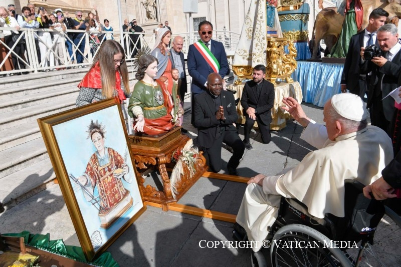 Kedves testvéreim és nővéreim, a megbocsátás nem elvesz, hanem ad! Mit ad a megbocsátás? Méltóságot! A megbocsátás nem elvesz, hanem méltóságot ad az embernek, arra késztet, hogy tekintetünket magunkról a másik felé fordítsuk, hogy – persze – gyarlónak lássuk, mint amilyenek mi vagyunk, de mindig testvérnek és nővérnek az Úrban. Testvéreim és nővéreim, a megbocsátás annak a buzgóságnak a forrása, amely irgalmassággá válik, s alázatos és örömteli életszentségre hív, mint amilyen Szent Bakhita életszentsége volt.