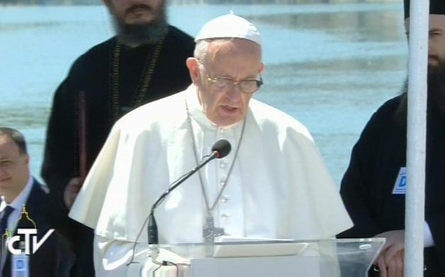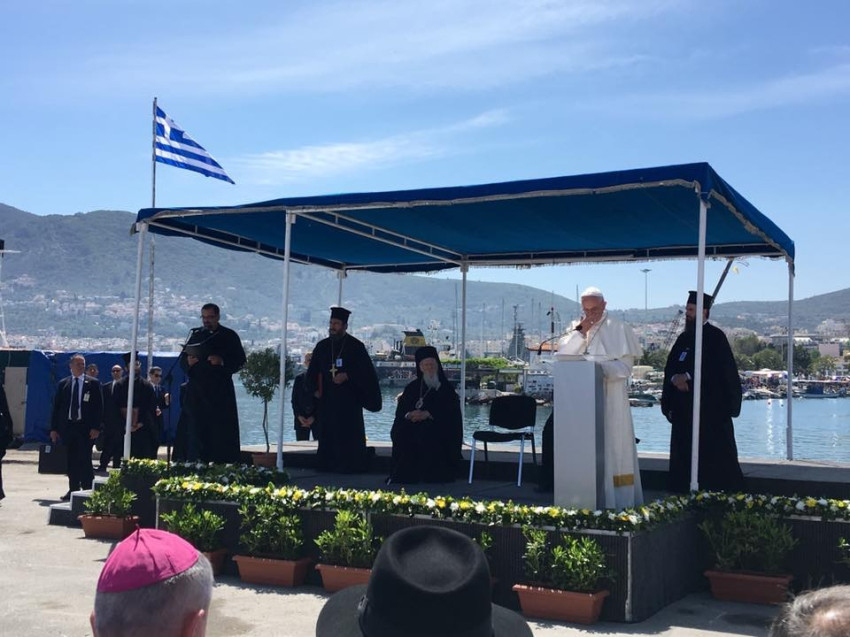 Azóta bennem élt a vágy, hogy idejöjjek, amióta Leszbosz szigete békét és méltóságot kereső sok bevándorló kikötőjévé vált. Ma köszönetet mondok Istennek, amiért megadta nekem, hogy eljöhettem. Köszönetet mondok Pavlópulosz elnök úrnak, amiért meghívott, együtt Bartholomaiosz pátriárkával és Hierónümosz érsekkel.