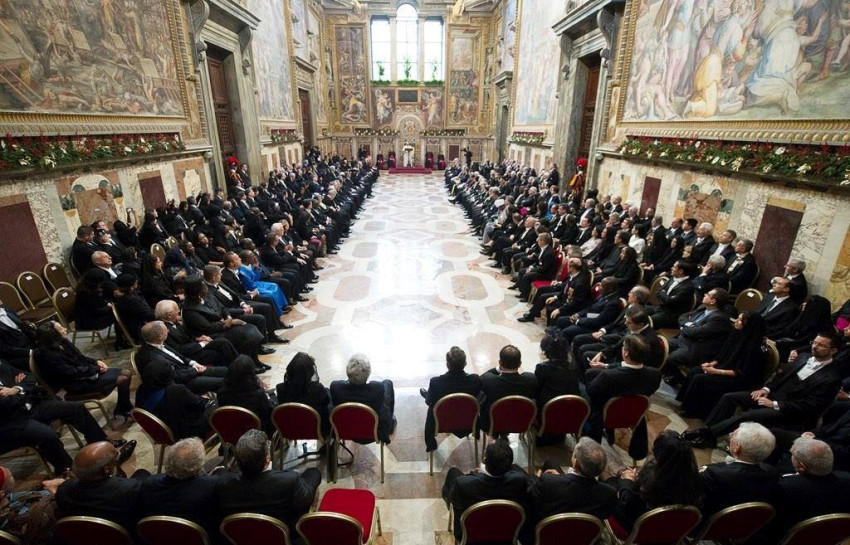 A pápa hosszú beszédében felsorolta az elmúlt év pozitív jeleit: az új diplomáciai kapcsolatok, illetve egyezmények születését a vallásszabadság és a kölcsönös párbeszéd bizonyítékaként. Visszatekintett apostoli útjaira, a családoknak szentelt világtalálkozóra és a püspöki szinódusra, az irgalmasság szentévének meghirdetésére, majd felszólalása nagy részében a migráció problémakörével foglalkozott.