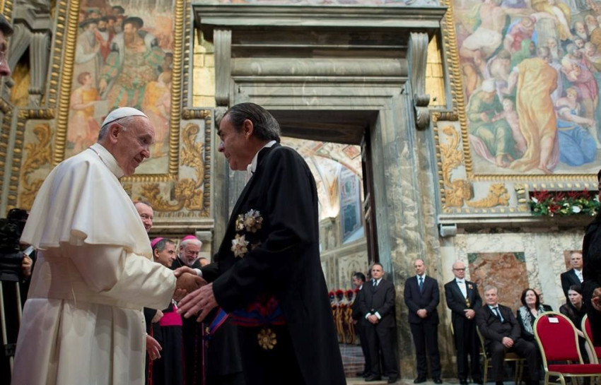 A Szentatya örömmel nyugtázta, hogy az elmúlt évben növekedett a szentszéki nagykövetek száma. A Vatikán jelenleg 180 állammal tart fönn diplomáciai kapcsolatokat. Több nemzetközi egyezményt aláírtak vagy ratifikáltak 2015-ben, amelyek közül a pápa kiemelte az Olaszországgal és az USA-val kötött pénzügyi megállapodást, mely arról tanúskodik, hogy a Szentszék elkötelezett a gazdasági kérdések áttekinthető kezelésére. Felsorolta még a Kelet-timori Demokratikus Népi Köztársasággal, Csáddal, Palesztinával és Kuvaittal megkötött egyezményeket. Mindez azt mutatja, hogy igenis lehetséges a különböző vallások közötti békés együttélés ott, ahol tiszteletben tartják a vallásszabadságot, és mindenki számára biztosítják a kulturális hovatartozás tiszteletét. Egyébiránt pedig minden hitelesen megélt vallás csak a békét szolgálhatja – fűzte hozzá a Szentatya.