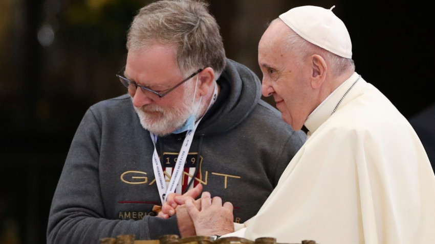 A szegények napja. Köszönetet mondok a szegényeknek, akik megnyitják szívüket, hogy nekünk adják gazdagságukat és gyógyítsák sebzett szívünket. Köszönöm ezt a bátorságot. Köszönöm, Étienne, hogy tanulékonyan figyeltél a Szentlélek sugallatára. Köszönöm a többéves munkádat; és azt a „makacsságot” is, hogy a pápát Assisibe hozd! Köszönöm! Köszönöm, Bíboros úr, a támogatását, a segítségét, melyet az Egyház eme mozgalmának nyújt – azért mondjuk „mozgalomnak”, mert mozgolódnak –, és köszönöm a tanúságtételét. Köszönetet mondok mindnyájatoknak! A szívemben hordozlak benneteket! És kérlek, ne feledkezzetek el imádkozni értem, mert nekem is megvannak a szegénységeim, méghozzá sok! Köszönöm!