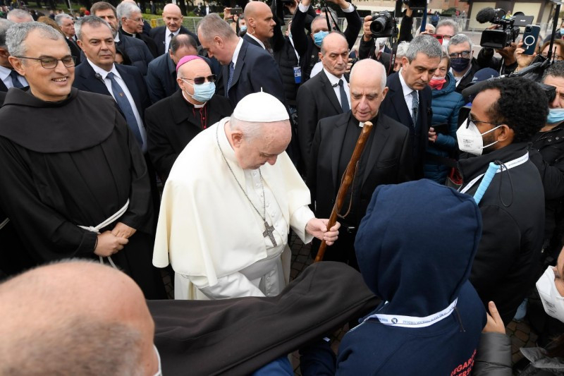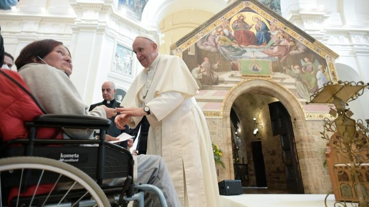 Köszönöm, hogy elfogadtátok meghívásomat – én voltam a meghívott! –, hogy itt Assisiben, Szent Ferenc városában ünnepeljük meg a szegények ötödik világnapját, mely holnaputánra esik. Ennek a világnapnak az ötlete tőletek származik, egyre jobban kibontakozott, és immár az ötödik világnaphoz érkeztünk. Assisi nem olyan város, mint bármelyik másik: magán hordozza Szent Ferenc arcát. Ha belegondolunk, hogy ezeken az utcákon élte nyugtalan ifjúságát, itt kapott meghívást arra, hogy az evangéliumot szó szerint megélje, ez alapvetően fontos tanítás számunkra. Persze, bizonyos szempontból az ő szentsége megrémít bennünket, mert lehetetlennek tűnik, hogy utánozzuk őt, de amint felidézzük életének bizonyos részleteit, azokat a „fiorettiket”, amelyeket azért gyűjtöttek össze, hogy megmutassák hivatásának szépségét,