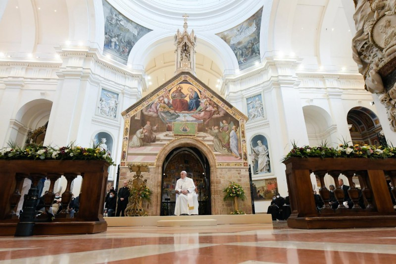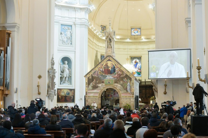 Itt vagyunk a Porciunkulában, az egyik olyan kis templomban, amelyet Szent Ferenc helyre akart állítani, miután Jézus azt kérte tőle, hogy „állítsa helyre a házát”. Akkoriban nem gondolta volna, hogy az Úr arra kéri majd, hogy életét ne a kövekből épült ház felújításának, hanem az emberekből, férfiakból és nőkből épült Egyház felújításának szentelje, amelynek ők az élő építőkövei. És ha ma mi itt vagyunk, akkor pontosan azért vagyunk itt, hogy tanuljunk abból, amit Szent Ferenc tett. Ő szeretett sokáig imádkozni ebben a kis templomban. Itt elcsöndesedett, magába mélyedt, hallgatta az Urat, arra figyelt, mit akar tőle Isten. Mi is ezért jöttünk ide: