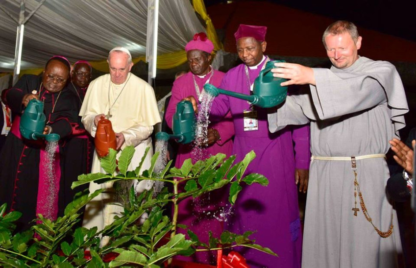 Ferenc pápa Munyonyóban megáldotta az új templom alapkövét, majd a kegyhely gondozását végző ferences rendház előtt találkozott a hitoktatókkal, tanítókkal és tanárokkal. Beszédében emlékeztetett arra, hogy Jézus nemcsak apostolokat és pásztorokat adott egyházának, hanem tanítókat is, hogy építsék az egyház testét hitben és szeretetben.