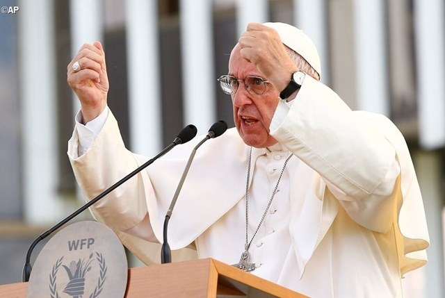 Hozzátette: „Ugyanis egy furcsa ellentmondásos helyzettel állunk szemben: Miközben az élelmezés terén a segítség és a fejlesztési tervek érthetetlen politikai cselszövések és döntések akadályába ütköznek a félrevezető ideológiák és áthatolhatatlan vámakadályok következtében, addig a fegyverek esetében ez nem így történik! Nem számít az eredet, ezekkel szabadon közlekedhetnek egy arcátlanul magabiztos és szinte abszolút szabadság jegyében, a világ bármely részén. Ilyen módon a háborúkat táplálják s nem az embereket. Sőt, némely esetben az éhezést háborús fegyverként használják, mert az éhezéstől és végkimerüléstől elpusztult embereket hozzászámítják azokhoz a harcosokhoz, akik a csatatéren esnek el, és azokhoz a polgári személyekhez, akik a konfliktusok következtében halnak meg.”