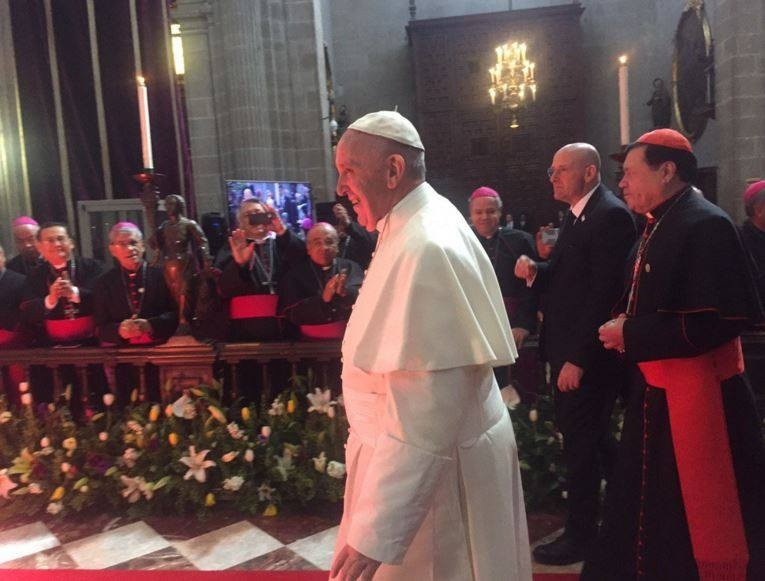 Ebbe a történelmi, metropolita székesegyházba látogatott el Ferenc pápa és találkozott a mexikói főpásztorokkal, élükön Rivera Carrera bíborossal, Mexikóváros érsekével.