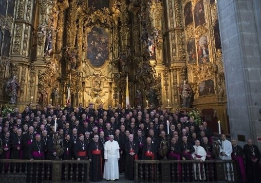 A Szentatya a mexikóvárosi Nagyboldogasszony metropolita székesegyházban találkozott a mintegy 120 mexikói püspökkel. A pápa gondolatmenetének az alapja az a gyengéd pillantás volt, ahogy a Guadalupei Szűz, a „Morenita” rátekint az emberekre és ezt a pillantást, a mögötte rejlő gazdag tartalommal, kell megtanulnia a mexikói főpásztoroknak. A morenita spanyol szó, feketécskét jelent, a Szűzanya mesztic arcszínére utal, mely az őslakosok és a betelepülő fehér spanyolok isteni ötvözete. A Szűzanya identitása tehát az Újvilágban a mesztic!