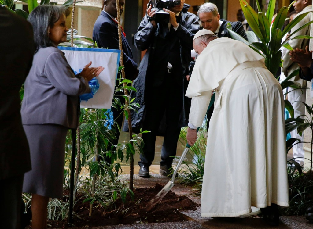 A pápa a faültetés jelentőségteljes gesztusából indult ki beszédében. Hangsúlyozta, ez arra hív minket, hogy folytassuk a küzdelmet az erdőirtás és az elsivatagosodás ellen; továbbá arra ösztönöz, hogy bizakodjunk, és konkrétan vállaljunk elkötelezettséget az igazságtalanság és a pusztulás átalakítása iránt.