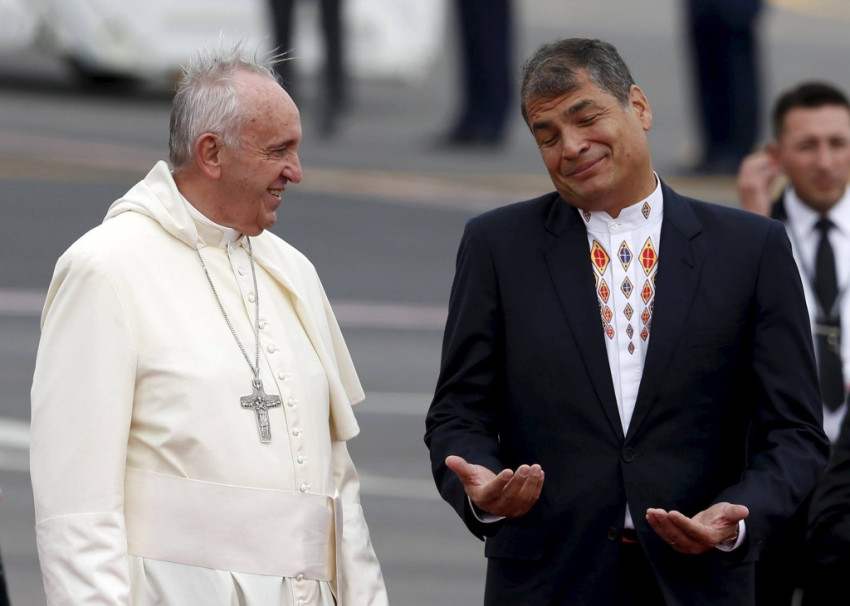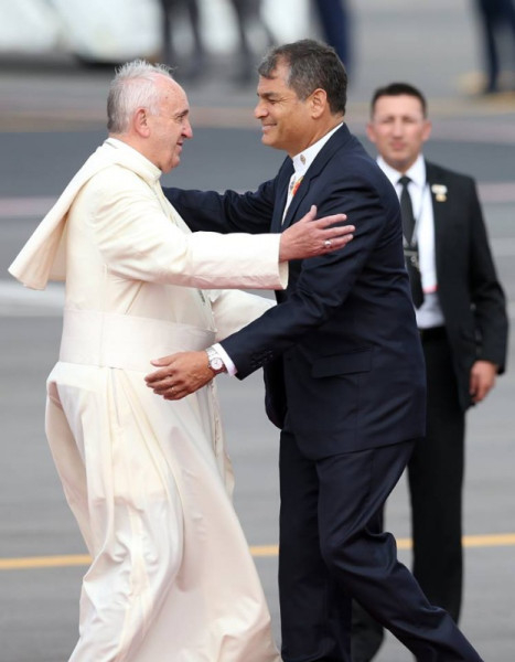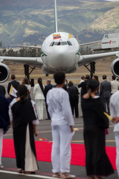 A Szentatyát Rafael Correa elnök és felesége, valamint állami és egyházi méltóságok fogadták, köztük Giacomo Ottonello érsek, ecuadori apostoli nuncius.