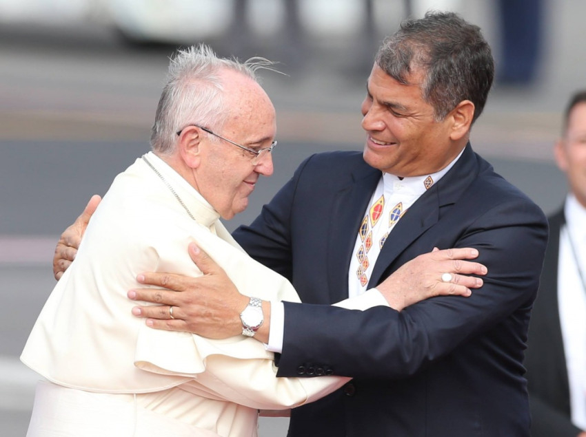 Ferenc pápa köszöntötte Rafael Correát, az államelnököt, a kormány képviselőit, püspöktestvéreit, az ország helyi egyházának híveit, és mindazokat, akik kinyitják előtte szívük, családjuk, hazájuk kapuját.