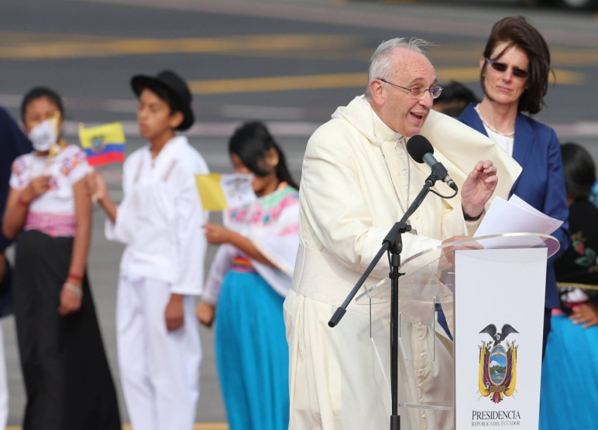 A pápa hálát adott Istennek, amiért megadta neki a lehetőséget, hogy ismét Latin-Amerikába érkezhet, és ezúttal meglátogathatja Ecuador szép földjét. Örömét fejezte ki a meleg fogadtatásért, amely újabb bizonyítéka annak, hogy Ecuador nemes népét a befogadás jellemzi.