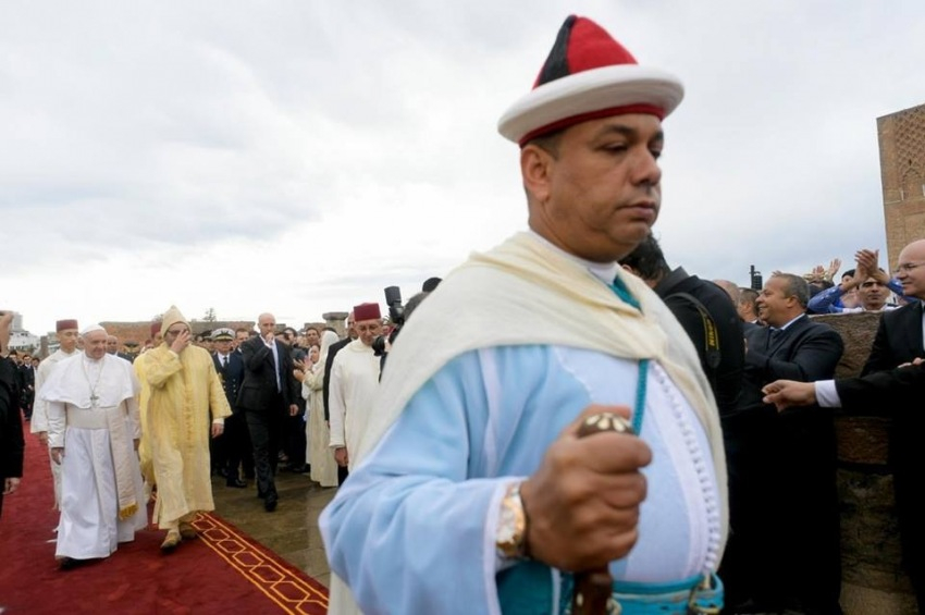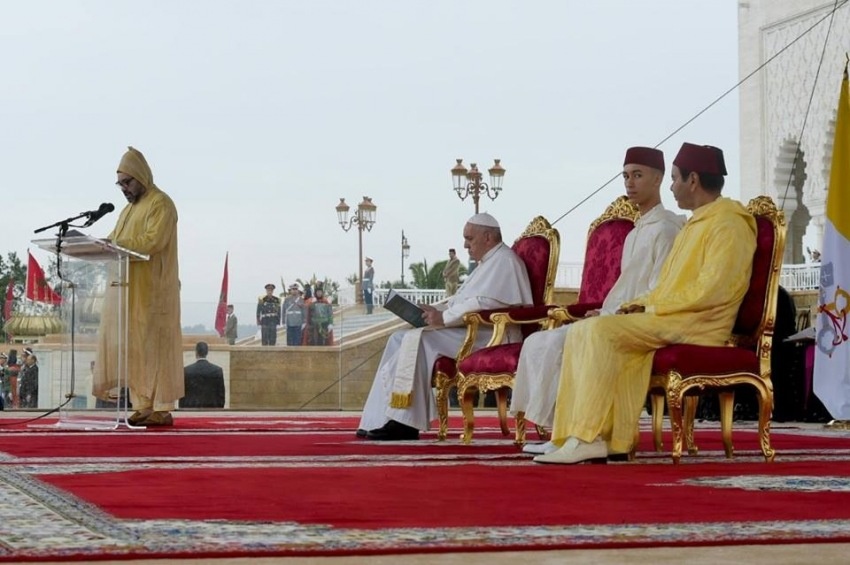 Szálem álejkum! (Béke Önökkel)! – köszöntötte Ferenc pápa VI. Mohamed királyt, a királyi család tagjait, a Marokkói Királyság hatóságait, a diplomáciai testület tagjait, a marokkói népet. A rabati Hasszán-toronynál elhangzott beszédében a Szentatya örömét és háláját fejezte ki, hogy ezen a természeti szépségekben gazdag földön járhat, amely ősi civilizációk maradványainak őrzője és egy varázslatos történelem tanúja.