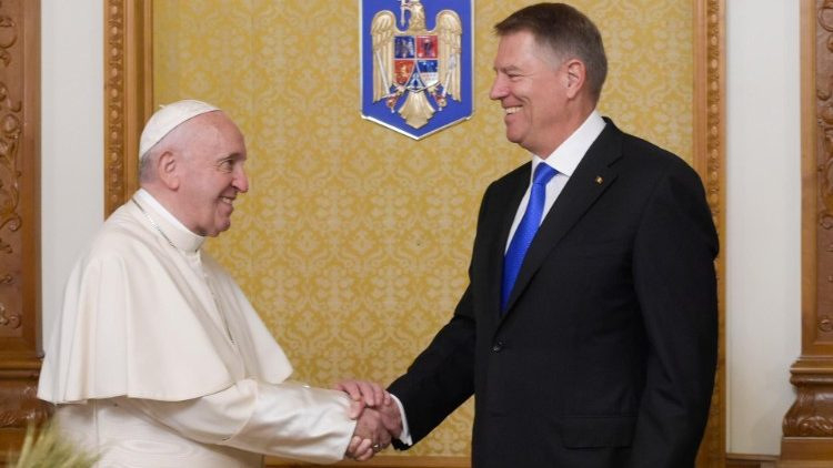 A Szentatyát köszöntő beszédében Iohannis elnök örömének adott hangot, hogy a pápa néhány napig Szent András apostolnak, Románia védőszentjének földjén tartózkodik. A katolikus egyházfőt Bukarestben, Jászvásáron, Csíksomlyón és Balázsfalván nagy szeretettel fogadják. Az elnök összefoglalta az elmúlt húsz év eseményeit, a II. János Pál pápa látogatása óta elért eredményeket, különös tekintettel az EU-csatlakozásra és a jelenlegi soros román elnökségre. Úgy fogalmazott: a totalitarizmus tragikus tapasztalata után Romániában ma mindenki félelem és akadály nélkül dicsőítheti az Urat románul vagy a nemzeti kisebbségek bármelyik nyelvén. Az elnök méltatta a Románia és a Szentszék között fennálló jó kapcsolatokat, amelyeket 1920-ban létesítettek. Európának ma a békés együttélés, a kisebbség és többség, a kultúrák közötti párbeszéd modelljeire van szüksége, ami a tolerancia és a kölcsönös tisztelet megerősítését szolgálja. Románia példamutatóan biztosította és biztosítja jelenleg is a területén élő húsz történelmi nemzeti kisebbség jogait – jelentette ki Iohannis elnök. Hozzátette: ehhez hasonló módon a többségében ortodox vallású országban az állam vallásszabadságot biztosít minden felekezetnek, melyek között mély és kölcsönös tiszteleten alapuló párbeszéd folyik.