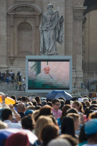 Az őszi családszinódus távlatában szemlélve a szülői hivatást, a pápa annak misztériumáról beszélt. Minden szülői hivatás, az apaság és az anyaság is az Istentől ered. Ő hív bennünket a kölcsönös és feltétlen szeretetre és ennek gyümölcseként a gyermekvállalásra. Ez a nagyszerű szülői hivatás adja meg a lehetőségét annak, hogy az ember teljesen megvalósítsa önmagát, mert hasonlóvá válik az Istenhez. Apává és anyává lenni tesz bennünket sokkal inkább hasonlóvá az Istenhez. Ez a szülői mivolt egyfajta tanúságtétel is az összes többi keresztény számára, a papok és a szerzetesek számára is, hiszen ők a lelki apaságra és lelki anyaságra kapnak tőletek impulzust. A szeretet szépségét kell megmutatnotok, nem a múlékony lelkesedést, hanem hogy hisztek benne, hogy minden veszekedés után békére találtok. Tudjátok, milyen szép, amikor a gyerekek előtt megcsókoljátok egymást!