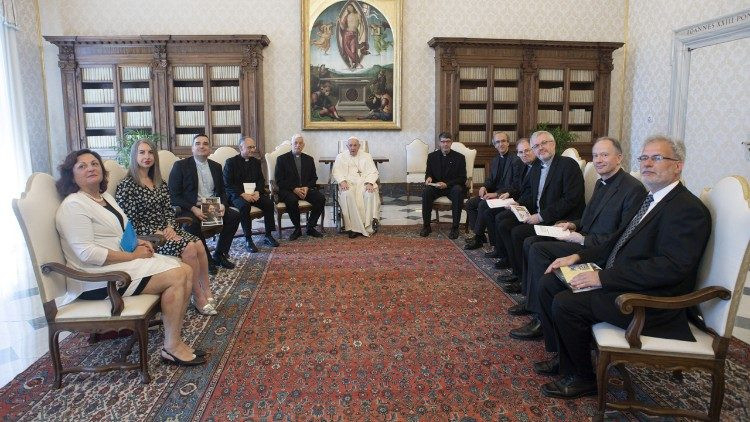 „Isten hozott benneteket! Látjátok? Az új hordozható trónusomon ülök” – viccelődött a pápa, arra utalva, hogy térdfájdalmai miatt kerekesszékben ül. Ferenc pápa személyesen, egyenként köszöntötte a Jézus Társasága európai kulturális folyóiratainak főszerkesztőit, akik az Apostoli Palota magánkönyvtárában audienciára gyűltek össze.