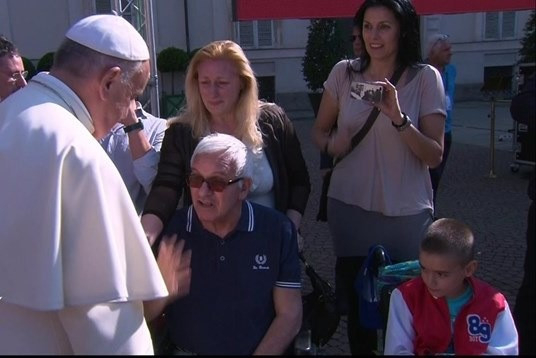 A Szentatya egyenként köszöntötte és megáldotta a jelen lévő betegeket, majd beszédet intézett hozzájuk.