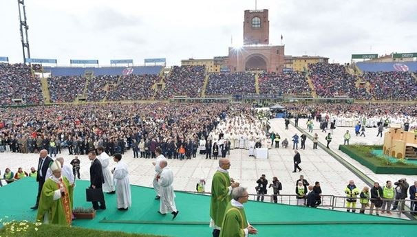 Végül a harmadik p: a szegények (poveri). Sajnos még manapság is sok ember nélkülözi az élethez szükséges dolgokat. De sokan vannak olyanok is, akik a szeretet koldusai, magányos emberek, Istent nélkülöző emberek. Mindnyájukban ott találjuk Jézust, mert Jézus a világban a szegénység, a semmivé válás útját járta, amint Szent Pál mondja a szentleckében: „rabszolgasorsot vállalva kiüresítette önmagát” (Fil 2,7). Az Eucharisztiától eljutunk a szegényekig, megyünk, hogy Jézussal találkozzunk. Ti is felhasználtátok ezt a feliratot, amelyet Lercaro bíboros szeretett látni az oltárra vésve: „Ha osztozunk az égi kenyérben, hogyan ne osztoznánk a földi kenyérben?” Jó, ha mindig emlékszünk erre! Isten szava, a kenyér, a szegények: kérjük a kegyelmet, hogy sose feledkezzünk el ezekről az alapételekről, amelyek táplálnak bennünket utunkon!