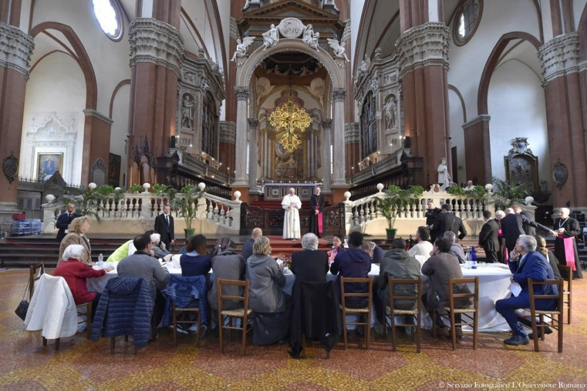 Ferenc pápa a San Petronio-bazilikában ebédelt, ahol ezer szegénynek terítettek ünnepi asztalt. A Caritas által szervezett ebéden Olaszország negyedik legnagyobb székesegyházában 1400 szegény, beteg ember vett részt, köztük fogvatartottak és menekültek.