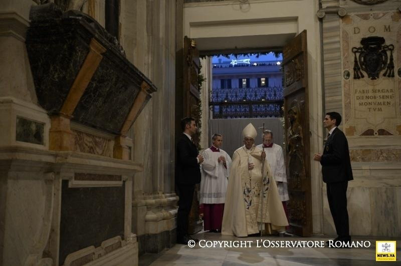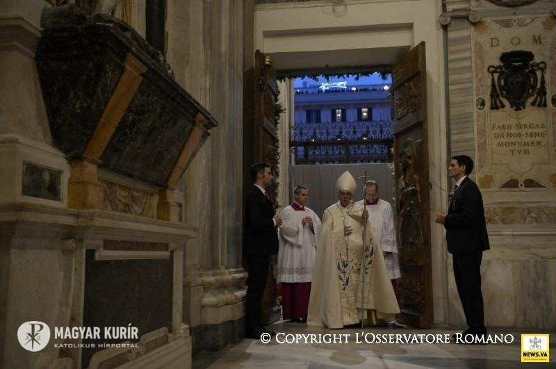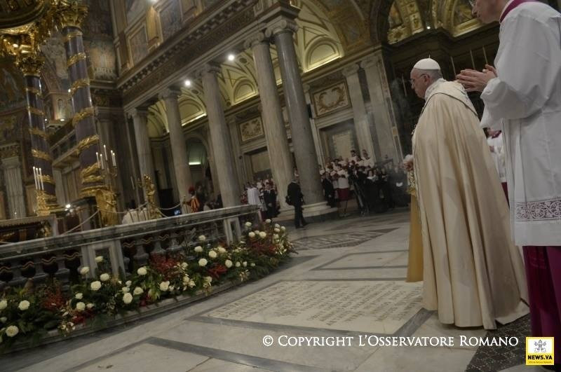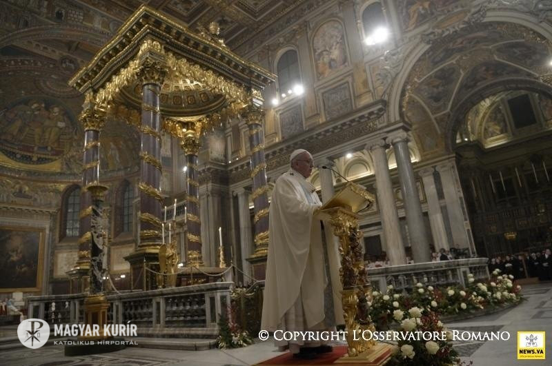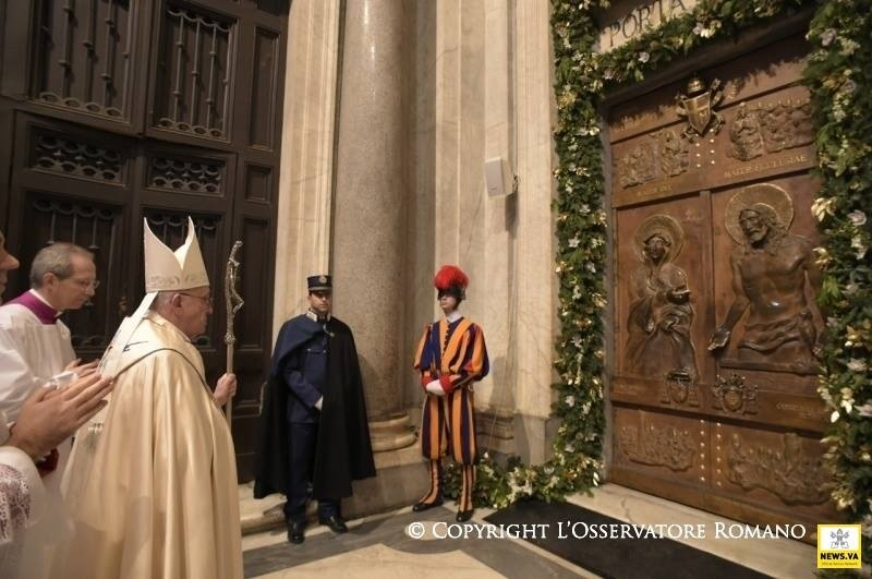 Sosem volt alkalmasabb, mint éppen ma, hogy Szűz Máriát az irgalmasság anyjaként szólítsuk meg. A szent kapu ugyanis, melyet megnyitottunk, valóban az irgalmasság kapuja. Bárki átlépi azt a küszöböt, meghívást kap, hogy megfürödjön az Atya irgalmas szeretetében, teljes bizalommal, minden félelem nélkül; és azzal a bizonyossággal indulhat útjára ebből a bazilikából, hogy Mária ott lesz mellette útitársként. Ő az irgalmasság anyja, mert magának az isteni irgalmasságnak az arcát foganta és hordozta méhében, Jézust, az Emmánuelt, akire a népek vártak, a „béke fejedelmét” (Iz 9,5). Isten Fia, aki testté lett a mi üdvösségünkért, nekünk adta anyját, aki velünk együtt zarándokol, hogy sose hagyjon magunkra életünk útján, főként a bizonytalanság és a fájdalom időszakaiban.