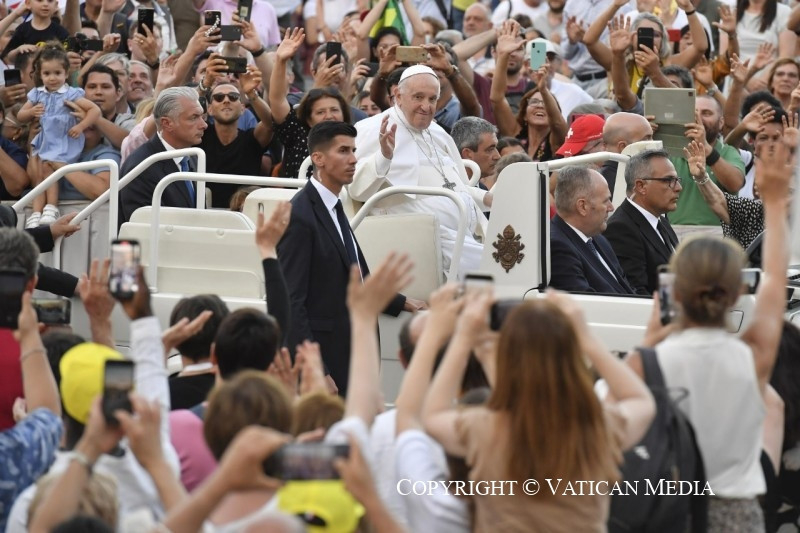 Kedves családok, ti is meghívást kaptok arra, hogy ne legyen más prioritásotok, „ne nézzetek hátrafelé”, vagyis ne sírjátok vissza a korábbi életet, a korábbi szabadságot, annak megtévesztő illúzióival: az élet megkövesedik, ha nem fogadjátok el Isten hívásának újdonságát, és a múlton siránkoztok. És ez az út, amikor visszasírjuk a múltat, és nem fogadjuk be az Isten által küldött új dolgokat, megkövesít bennünket, mindig; keménnyé tesz, nem emberivé tesz bennünket.