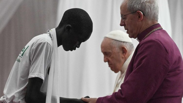 Végezetül szeretnék szólni ahhoz a sok dél-szudáni menekülthöz, akik az országon kívül vannak, és akik nem térhetnek vissza, mert területüket elfoglalták. Közel állok hozzájuk, és kívánom, hogy ismét földjük jövőjének főszereplőivé válhassanak, konstruktív és békés módon hozzájárulva annak fejlődéséhez. Nyakuor Rebecca, különleges áldást kértél tőlem a dél-szudáni gyermekekre, hogy mindannyian békében együtt növekedhessetek. Mi, hárman, mint testvérek fogjuk az áldást adni: Justin testvéremmel és Iain testvéremmel együtt fogjuk adni az áldást. Ezzel az áldással együtt a világ megannyi keresztény testvérének és nővérének áldása szálljon le rátok, akik ölelnek és bátorítanak benneteket, tudva, hogy bennetek, hitetekben, belső erőtökben, békeálmaitokban az emberlét egész szépsége ragyog fel.