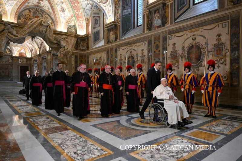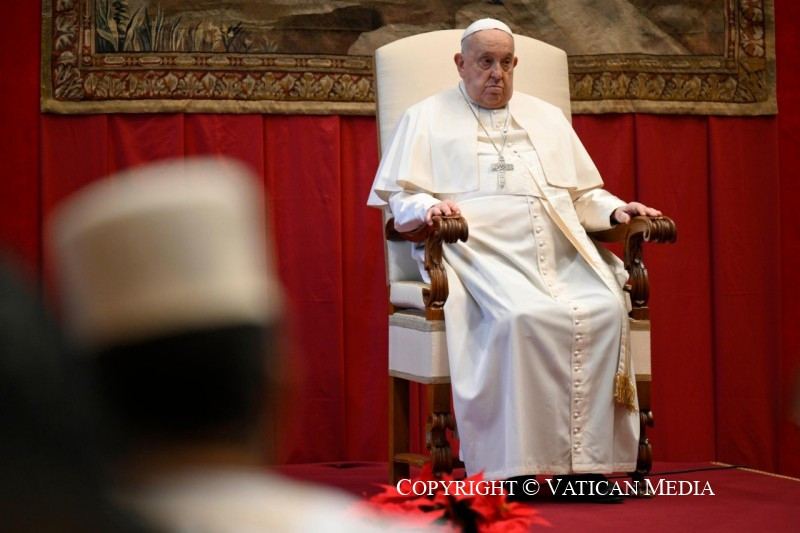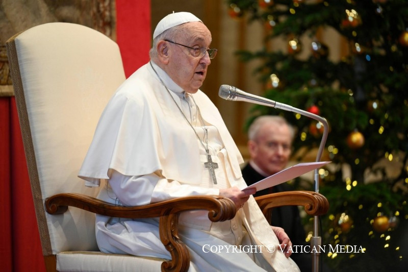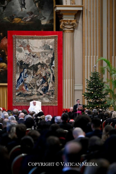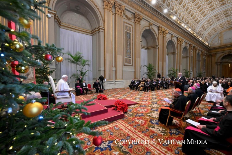 Ferenc pápa köszöntötte a diplomáciai testület dékánját, George Poulides-t, majd visszatekintett a 2024-es év eseményeire: Több mint harminc állam- és kormányfőt fogadott a Vatikánban; kiegészítő megállapodást írt alá a Szentszék és Burkina Faso a Katolikus Egyház jogi státuszáról, valamint a Cseh Köztársasággal egyes jogi kérdéseket illetően, amelyekről tavaly döntöttek; októberben újabb négy évre megújították a Szentszék és a Kínai Népköztársaság közötti ideiglenes megállapodást a püspöki kinevezésekről, ami a tiszteletteljes és építő párbeszéd folytatásának szándékát mutatja a Katolikus Egyház és az egész kínai nép javára.