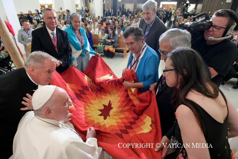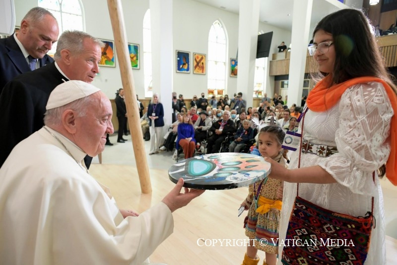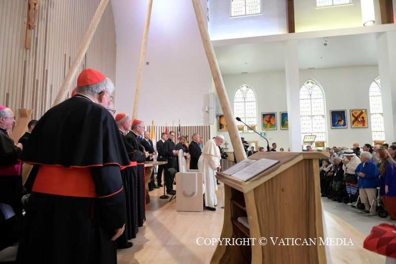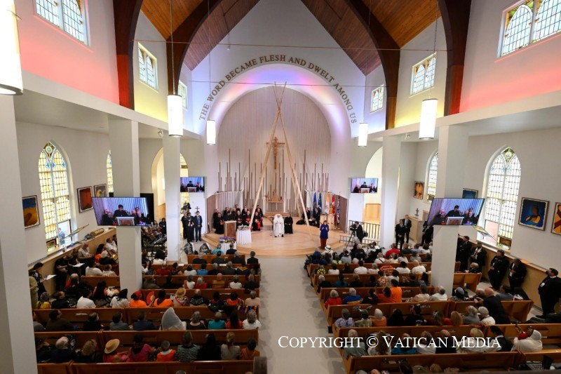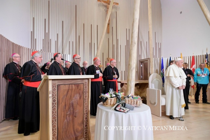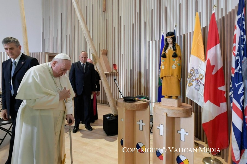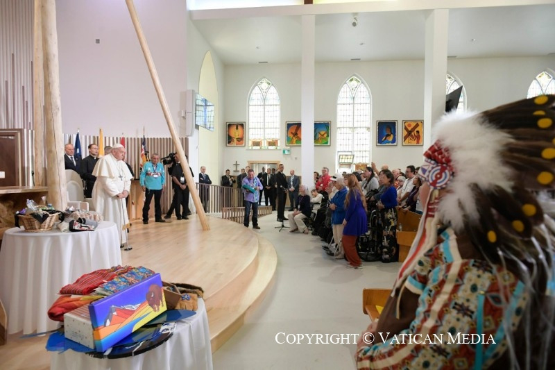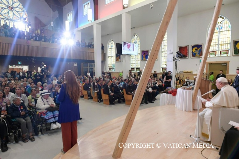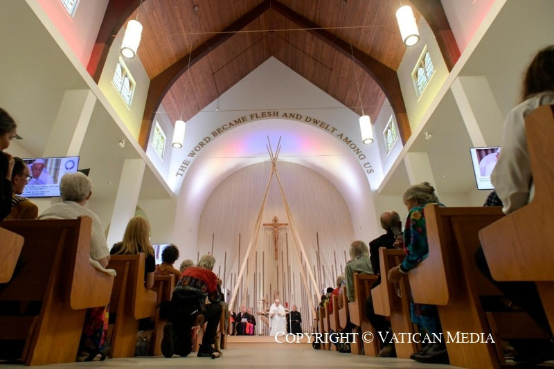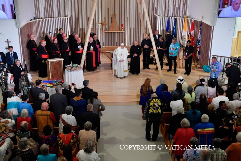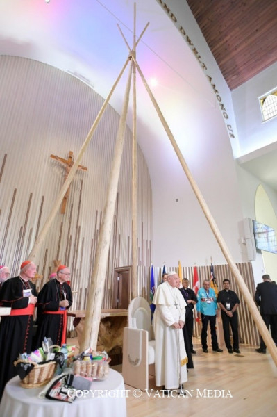 Ti, kedves őslakos testvéreim és nővéreim, sokat taníthattok nekünk a fa létfontosságáról, hiszen a fa, a gyökerei által a földdel egyesülve, levelein keresztül oxigént ad, és gyümölcseivel táplál bennünket. És gyönyörű látni a fa szimbolikáját e templom felépítésében: egy farönk a földhöz kapcsolja az oltárt, amelyen Jézus az eucharisztiában kiengesztel bennünket, „egy kozmikus szeretetet kifejező cselekményben”, mely „összeköti az eget és a földet, átfogja az egész teremtést” (Laudato si’ enciklika, 236). Ez a liturgikus szimbolika eszembe juttat egy csodálatos szöveget, melyet Szent II. János Pál mondott ebben az országban: „Krisztus élteti minden kultúra szívét, így a kereszténység nemcsak magában foglal minden őslakos népet, hanem testének tagjaiban maga Krisztus is őslakos” (Igeliturgia Kanada őslakosaival, 1984. szeptember 15.).