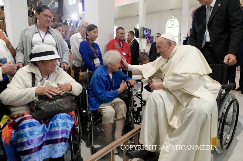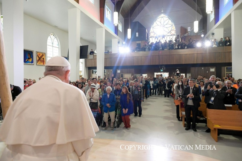 Örülök, hogy találkozhatom veletek, és újra láthatom az őslakosok több képviselőjének is az arcát, akik néhány hónappal ezelőtt meglátogattak Rómában. Az a találkozó nagyon sokat jelentett számomra. Most a ti házatokban vagyok, barátként és zarándokként a földeteken, a templomotokban, ahol testvérként összegyűltök, hogy Istent dicsérjétek. Rómában, miután meghallgattalak benneteket, azt mondtam nektek, hogy „a hatékony gyógyulási folyamathoz konkrét intézkedésekre van szükség” (Beszéd a kanadai őslakos népek küldöttségeihez, 2022. április 1.). Örömmel látom, hogy ebben az egyházközségben, ahol a First Nations, a métisek és az inuitok különböző közösségeiből származó emberek, valamint a helyi városnegyedből származó nem őslakosok és a bevándorló testvérek is mind megtalálhatók, már elkezdődött ez a folyamat. Ez egy mindenki számára nyitott, befogadó otthon, amilyennek az Egyháznak is lennie kell: Isten gyermekeinek családja, ahol a vendégszeretet és a befogadás, az őshonos kultúra jellegzetes értékei lényegi fontosságúak; ahol mindenki szívesen látottnak érezheti magát, függetlenül saját történelmétől és életkörülményeitől. Szeretném megköszönni nektek azt is, hogy konkrétan közel álltok sok szegény emberhez (ez nagyon meghat engem) – akik ebben a gazdag országban is sokan vannak – szeretetetek által: ezt kívánja Jézus, aki azt mondta nekünk és mindig megismétli az evangéliumban: „Bizony mondom nektek, amit e legkisebb testvéreim közül eggyel is tettetek, velem tettétek” (Mt 25,40). Jézus van jelen bennük!