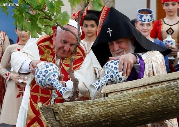 Ferenc pápa és II. Garegin, minden örmény katholikosza közösen öntöznek meg a jereváni ökumenikus találkozó után egy fát, amelyet egy Noé bárkáját ábrázoló ládába ültettek. A fa az örmény diaszpórában élő katolikusok szimbóluma, amely megöntözve új hajtásokat hozhat.
