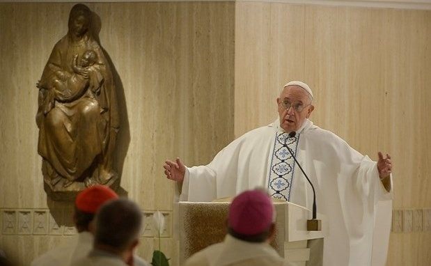 Az egyház anya, és mindannyiunkat anyaként fogad. Olyan anyaság ez, amely az alázat, a befogadás, a megértés, a jóság, a megbocsátás és a gyengédség tulajdonságaiban jut kifejezésre. Ahol pedig anyaság és élet van, ott öröm, béke és békében növekedés van. Amikor hiányzik ez az anyaság, ott csak a merevség, a fegyelem marad, és nincs mosoly. Az egyik legszebb és legemberibb dolog a mosoly, amikor rámosolygunk egy gyerekre, és megnevettetjük. Az Úr adja meg, hogy ma is, amikor újra felajánlja magát az Atyának értünk, ezt halljuk: „Fiú, íme a te anyád!” – zárta kedd reggeli homíliáját a pápa.