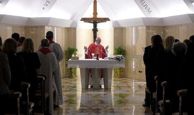 Gondoljunk arra a kínszenvedés előtti evangéliumi szakaszra, amikor Jézus így fordul Péterhez: „Simon, Simon, a sátán kikért titeket, hogy megrostáljon, mint a búzát. Én azonban imádkoztam érted, hogy meg ne fogyatkozzék a hited” (Lk 22,31–32). És amit Péternek mond, ugyanazt mondja neked, nekem, mindenkinek: Imádkoztam érted, imádkozom érted, most is imádkozom érted. Amikor pedig leszáll az oltárra, azért jön, hogy közbenjárjon, imádkozzon értünk. Mint a kereszten. És ez nagy biztonságot ad nekünk. Ehhez a közösséghez tartozom én szilárdan, mert a sarokköve Jézus, aki imádkozik értem, értünk. Jót tesz nekünk ma, ha elgondolkodunk az egyházról, az egyház e misztériumáról. Mind olyanok vagyunk, mint egy épület, de az alap Jézus, aki imádkozik értünk. Jézus, aki imádkozik értem.