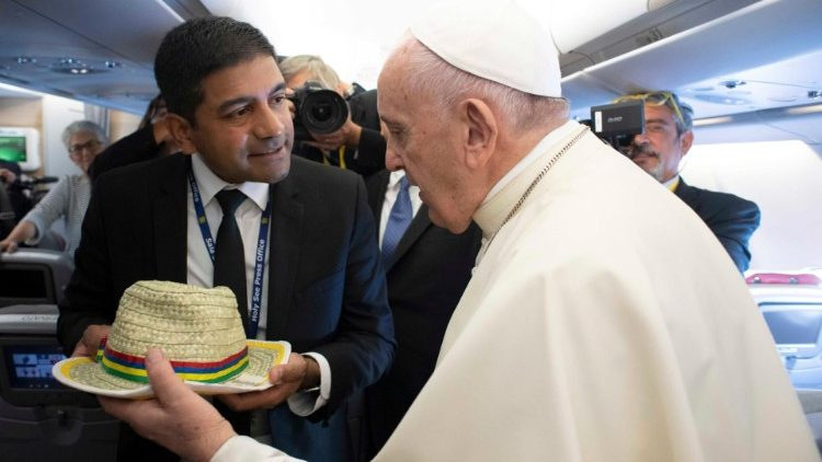 Ferenc pápa az újságírókhoz intézett köszöntésében reményét fejezte ki, hogy a hosszú út gyümölcsöző lesz. Emlékeztetett, hogy ez alkalommal nincs jelen a média képviselői között Valentina Alazraki mexikói újságírónő, aki rangidős a Szentszékhez akkreditált újságírók közül. A pápa elismerően szólt Valentina Alazraki most megjelent könyvéről, amelyben a bántalmazott, kihasznált nőkről és fájdalmukról ír. „Foglalkoznunk kell ezzel a témával” – figyelmeztetett a pápa. Utalt a spanyol EFE hírügynökség megalapításának 80. évfordulójára is, amely alkalomból tudósítójuk Afrikából visszatérőben soron kívül feltehet majd egy-két kérdést a pápának a repülőgép fedélzetén tartandó hagyományos sajtótájékoztatón.