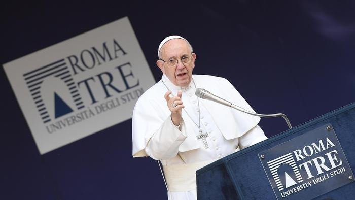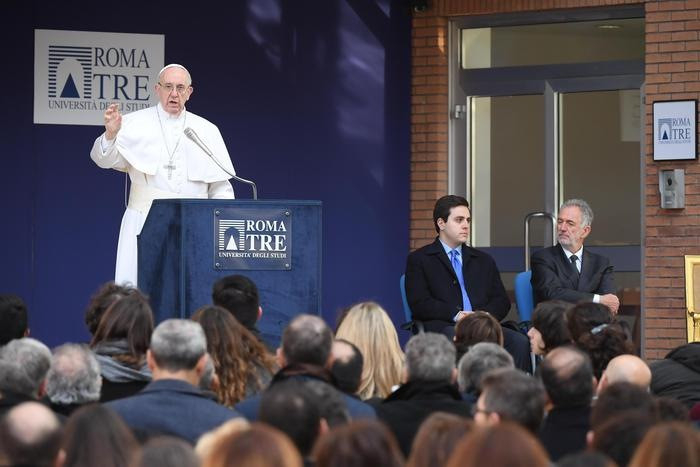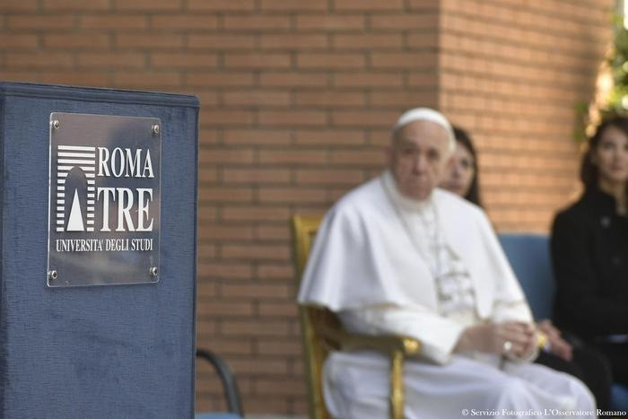 Ferenc pápa első alkalommal lépett be egy római állami felsőoktatási intézménybe. Itt azonnal világosan megfogalmazta elképzelését az egyetem szerepéről: legyen az a különbözőségek párbeszédének helye. A 25 éve működő Roma Tre egyetem az olasz főváros legfiatalabb állami felsőoktatási intézménye, ahol 40 ezer fiatal tanul. Megérkezésekor Mario Panizza rektor köszöntötte a pápát, aki ezt követően meghallgatta négy fiatal hozzá intézett kérdéseit, és rögtönzött szavakkal válaszolt nekik. A hallássérült hallgatók számára jeltolmács közvetítette gondolatait.