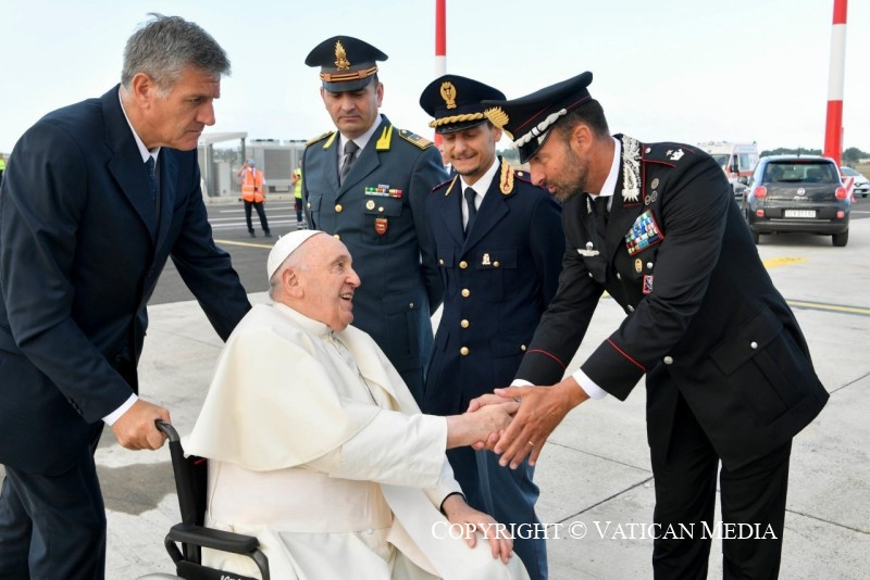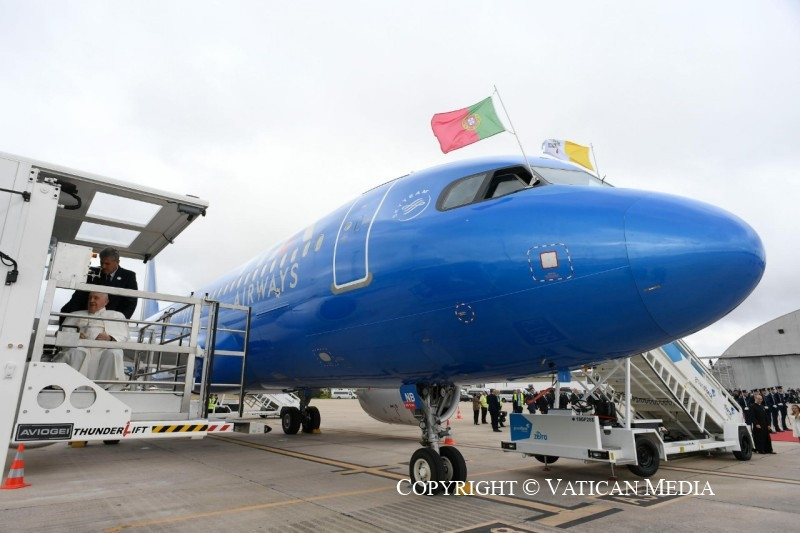 Ferenc pápa augusztus 2-án, szerdán délelőtt helyi idő szerint 10 órakor (magyar idő szerint 11 órakor) érkezett meg a portugál fővárosba. A Figo Maduro légibázison a köztársasági elnök fogadta és két népviseletbe öltözött kisgyermek egy virágcsokorral ajándékozta meg. Egy rövid megbeszélést követően a pápa a belémi nemzeti palotába, a volt királyi palotába ment, amelynek főbejáratánál Marcelo Rebelo de Sousa köztársasági elnök várta. Ezután sor került a hivatalos fogadási ceremóniára.