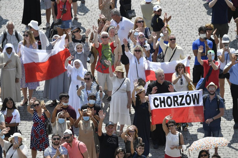 Üdvözöllek mindnyájatokat, római hívek és különböző országokból érkezett zarándokok! Sok ország van itt, látom a zászlókon… Külön köszöntöm a Pápai Észak-Amerikai Kollégium papjait és papnövendékeit – ott vannak –, valamint az abbiategrassói családokat és a polesinei motorosokat.