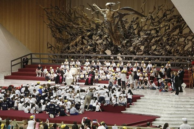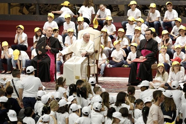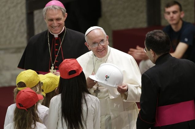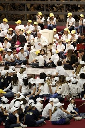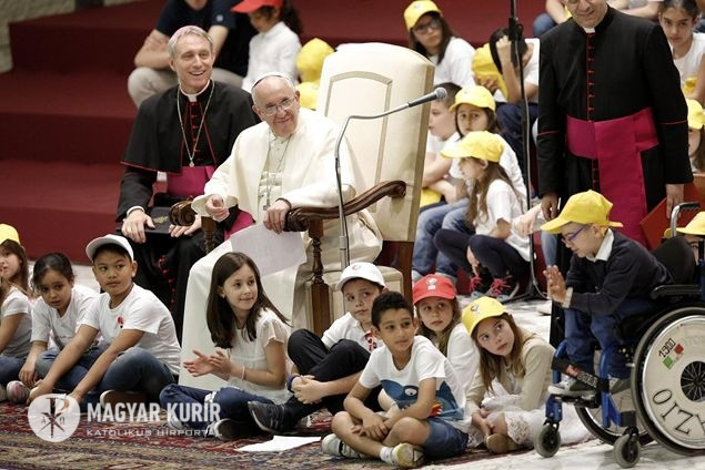 „A béke és a háború házát mindennap építik. Egy nagy különbséggel: az egyik kézműves műhely, a másik ellenben ipar. Az első a testvériség és a befogadás gesztusaival fordul az ember felé, a másik viszont bántja, mert haszonleső, és pénzt akar” – ezekkel a szavakkal fordult a pápa a gyerekekhez, akik a VI. Pál-teremből egyetlen hatalmas iskolai zsibongót teremtettek pillanatok alatt, zenéjükkel és lelkesedésükkel. Ferenc pápát azonnal maguk közé fogadták, a béke munkásaként fehér munkavédelmi sisakot húztak a fejére, majd kérdéseikkel ostromolták.